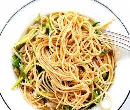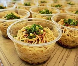 3. 拌面:将调好的酱料均匀地涂抹在面条上,加入葱花、香菜、花生碎、黄瓜丝、胡萝卜丝等配料。